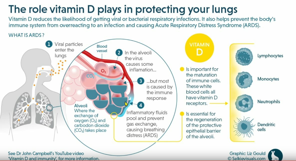 Vitamin D ist essentiell für die Regeneration der schützenden epithelialen Barriere der Alveoli in den Lungen, wo der Austausch von Sauerstoff und Kohlendioxid stattfindet. In den Alveoli verursacht das Virus lokale Entzündungen. Der Großteil wird aber von der Immunantwort selbst verursacht. Entzündete Flüssigkeitsansammlungen verhindern den Gasaustausch und verursachen Atemprobleme (ARDS). Vitamin D ist außerdem wichtig für die Reifung von Immunzellen. Weiße Blutzellen wie Lymphozyten, Monozyten, Neutrophile und Dendritische Zellen besitzen alle Vitamin-D-Rezeptoren.
