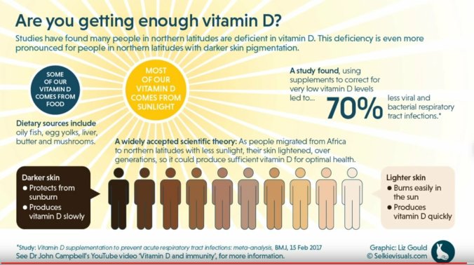 Ich verfolge die täglichen Youtube-Videos des Krankenschwester-Lehrers Dr. John Campbell nun schon seit Ausbruch der Pandemie Mitte März. Er hat von Beginn an die wichtige Rolle von Vitamin D betont und immer wieder bekräftigende Studien geliefert, etwa dass Vitamin D GENERELL gegen (schwere) Atemswegsinfektionen schützt. Bei Menschen mit ausgeprägtem Vitamin D-Mangel ist die medikamentöse Substitution effektiver als bei Menschen mit geringem Mangel oder normalen Werten. Bei ausgeprägtem Mangel verringert sich das Risiko jedoch um 70%! Er hat später auch aufgezeigt, dass in den USA 42% der Gesamtbevölkerung einen Vitamin D-Mangel aufweist. In der Bevölkerung mit dunkler Hautfarbe sind es sogar 82% und unter den Hispanos 70%. In zahlreichen Untersuchungen zur erhöhten Sterberate finden sich immer wieder Schwarze und Hispanos an der Spitze. In vielen Artikeln und Medienberichten wird die erhöhte Mortalitätsrate aber vorwiegend mit der gesellschaftlichen Benachteiligung in Verbindung gebracht, ein Faktor, aber möglicherweise nicht der alleinige Faktor.