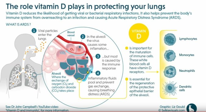 Campbell betont, um Missverständnissen vorzubeugen, dass Vitamin D nicht vor der Infektion mit Covid19 selbst schützt, aber vor gefährlichen antiviralen und bakteriellen Lungeninfektionen, eine der Hauptkomplikationen von Covid19.