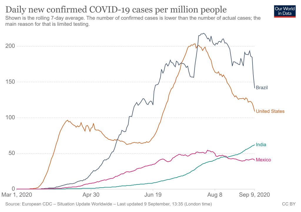 In Indien zeigt sich ein kontinuierlicher Anstieg seit dem Sommer, in den USA ein starker Anstieg im Hochsommer, in Brasilien wegen der Äquatornähe bei immer heißen Luftmassen anhaltend hohes Niveau an Neuinfektionen und Mexiko verharrt seit Juli auf einem hohen Niveau. Die Jahreszeit scheint dem Virus also relativ blunzn zu sein. Zudem wirken sich z.b. in den USA veraltete Klimaanlagegeräte mitunter sogar gegenteilig aus, weil sie mehr mit Umluft- als Frischluft arbeiten und die Luft viel zu trocken ist, was die Virusausbreitung über Aerosole begünstigt.