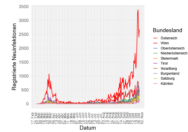 Die Zahl der Neuinfektionen ist ein Blick in die Vergangenheit, sie zeigt das Infektionsgeschehen vor 5-10 Tagen. Die verschärften Maßnahmen seit letztem Montag ändern nichts daran, dass sich im privaten Bereich, in der Gastronomie und in den Schulen nichts geändert hat bzw. ändert. Es gibt keinen Grund anzunehmen, dass die Zahlen plötzlich zurückgehen. Damit werden die kolportierten 5000 Neuinfektionen pro Tag schon in den kommenden 7-14 Tagen überschritten. Vom Jänner sind wir noch weit entfernt.