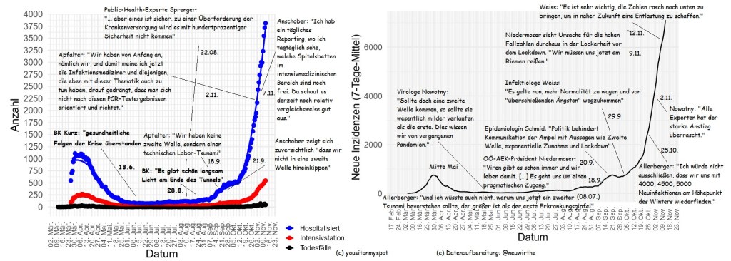 Überhaupt hätte ich nie gedacht, dass es noch einmal soweit kommen würde. Wie man einen zweiten Lockdown verhindern könnte, haben etliche Länder vorgelebt, mit Uruguay auch ein “Nichtinselstaat”. Hingegen wurde Mitte Juni die Maskenpflicht wieder gelockert und damit signalisiert, dass die gesundheitliche Krise überwunden wäre. Wie wir seit dem gestrigen zib2-Interview mit Statistiker Neuwirth wissen, begann ab dem Zeitpunkt auch das exponentielle Wachstum wieder, anfangs schleichend bei niedrigen Zahlen, spätestens ab August war das Problem aber sichtbar. Meine Befürchtung Anfang September sollte sich leider als wahr erweisen. Ausgerechnet im Frühherbst gab es noch etliche Scheinexperten, die uns mit veraltetem Wissen und Verharmlosung beglückten, sodass die zweite Welle richtig Fahrt aufnehmen konnte. Die letzten Beiträge von mir waren großteils Faktenchecks, weil die überlaufenden Spitäler ein klares Zeugnis vom Totalversagen der Verantwortlichen abgeben. Sich an der Bevölkerung abzuputzen ist zu leicht, wenn man sieht, welche führenden und reichweitenstarken Scheinexperten sich geäußert haben.