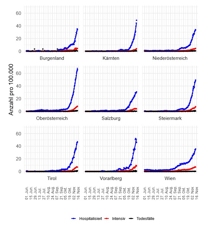 Der Lockdown war dafür gedacht, sich Gedanken zu machen, wie man sich bestmöglich auf eine zweite Welle vorbereiten kann. Pandemie statt Wintertourismus. Doch selbst der zweite Lockdown gilt weniger den überlasteten Spitälern als dem Weihnachtsgeschäft, bestenfalls noch dem verkaufsoffenen Feiertag am 8. Dezember. Wenn sich die Wirtschaftslobby da nicht irrt, denn die Zahl der Neuinfektionen wird noch mindestens zehn Tage weiter steigen und die der Hospitalisierungen noch einige Tage mehr. Die rar gewordenen Intensivbetten bleiben eher vier bis sechs Wochen auf hohem Niveau, eher länger. Überhaupt war es ein riesiger Fehler, die Ampel mit der Spitalsauslastung der verknüpfen. Die Ampel hätte so simpel bleiben sollen wie von den CSH-Forschern inoffiziell in Betrieb genommen – entscheidend ist einzig und alleine die Zahl der Neuinfektionen, weil nur die darüber entscheidet, wo Infektionsgeschehen zunimmt und frühzeitig unterbunden werden muss. Von den Neuinfizierten werden rund 25% einen Verlauf mit Komplikationen erleben, das heißt einer langwierigen Heilung mit vielen Rückfällen und längerem Krankenstand, bei 20% entwickeln sich psychiatrische Erkrankungen. Das österreichische Gesundheitssystem ist auf diese Betroffenen nicht vorbereitet. Die neoliberale Leistungspolitik der letzten Jahre hat die Zweiklassenmedizin forciert, psychologische Unterstützung ist chronisch unterfinanziert und was die Pandemie und die Jobverluste in der Psyche anrichten, war und ist seit März weitgehend tabu. Rund 20% der Neuinfektionen landen im Spital und 1-2% auf der Intensivstation. Bei gegenwärtig täglich 10000 Neuinfektionen kann sich jeder selbst ausrechnen, dass sich das nicht ausgeht.