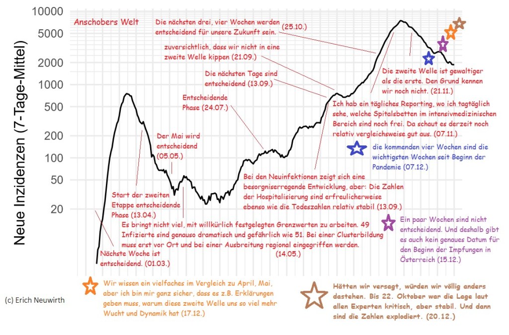 Am 13. Oktober (Tag 216) rantete ich mich auf Englisch aus und beschrieb schon ausführlich, weshalb Österreich die zweite Welle versaut hat. Eine längere Fassung auf Deutsch schrieb ich am 22. November (Tag 254). Jetzt ist Ende Dezember und Gesundheitsminister Anschober kann sich immer noch nicht erklären, warum die zweite Welle so viel stärker ausfiel als die erste.