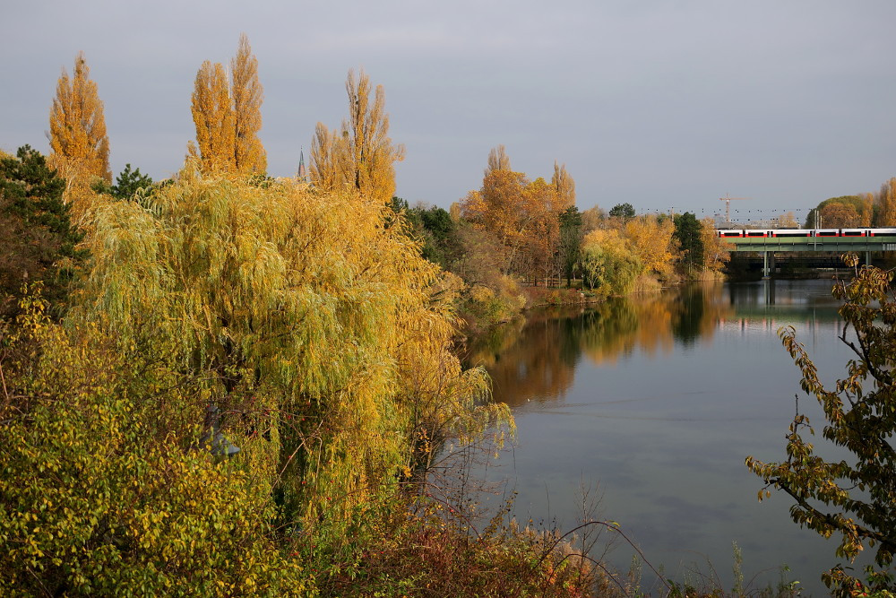 Wasserpark Floridsdorf mit S-Bahn-Garnitur im Hintergrund
