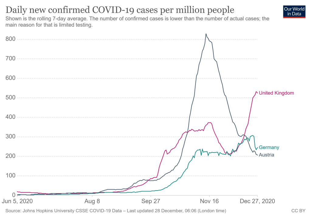 Österreich war Mitte November weltweit an der Spitze der täglichen Neuinfektionen und führte seit Anfang Dezember bei den täglichen Todesfällen, jeweils gemessen an der Einwohnerzahl.