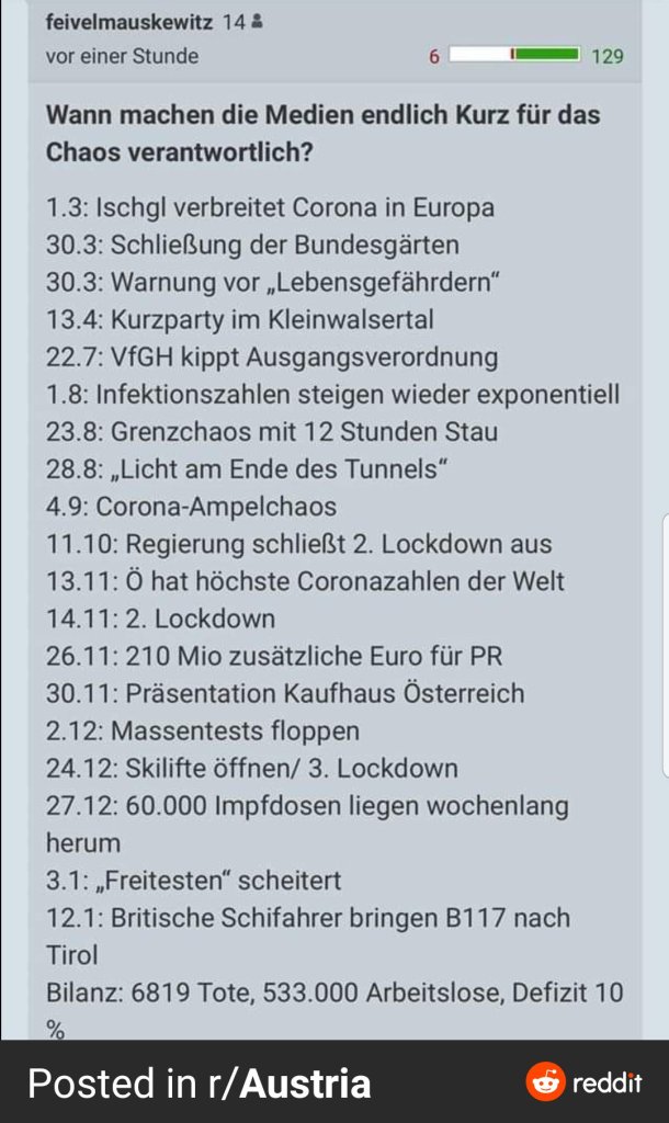 Die heimische Politik hat immer noch nichts gelernt aus dem Versagen der letzten Monate. Im Gegenteil. Kritik perlt an der Teflonregierung, die alles richtig gemacht hat, ab, gerne mit dem Verweis aufs Ausland, dass alle die gleichen Probleme haben würden, was nicht stimmt, aber der Durchschnittsösterreicher, der keine ausländischen Nachrichten sieht oder versteht, glaubt diese Ausrede.