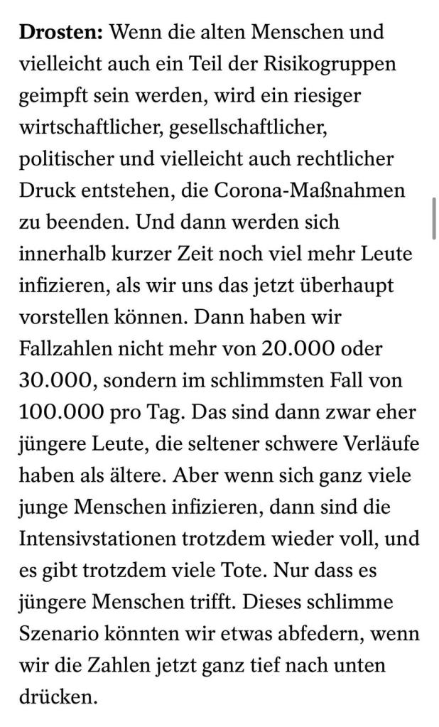 Drosten erwähnt Long COVID zwar nicht in dieser Antwort eines Spiegel-Interviews vom 22.01.21, aber wenn er das sagt, und das sagt er nicht als einziger, dann sollte man das erstnehmen. Das könnte man natürlich schon lange wissen, denn Medienberichte zu Long COVID gibt es nicht nur schon lange in Deutschland, sondern auch – anfangs vereinzelt und langsam zunehmend – auch in Österreich, zuletzt rückten auch Spätfolgen einer Corona-Infektion bei Kindern in den Vordergrund. Die meisten Journalisten dürften wesentlich regelmäßiger und quantitativ mehr Zeitungen mehr lesen als ich. Ihnen können diese Berichte nicht entgangen sein. Vielleicht halten sie für Einzelfälle? Dann hilft ein Blick über den Tellerrand: Die WHO versucht gerade nicht aus Jux und Tollerei eine gemeinsame klinische Beschreibung von Long COVID zu erstellen. Ich würde es gerne einmal erleben, dass die Frage an einen Experten gestellt wird, ob es medizinisch und ethisch vertretbar ist, höhere Infektionszahlen bei jüngeren Menschen zu tolerieren – mit dem, was wir über die Erkrankung COVID19 seit Monaten wissen.