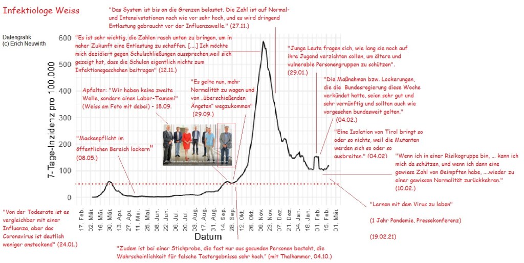 Am 19.02 hielt die Bundesregierung eine Pressekonferenz zum Rückblick auf ein Jahr Pandemie ab. Neben der ausgegebenen Devise, ab jetzt “mit dem Virus leben” zu müssen, sprach auch Infektiologe Weiss, der – wie mein Schaubild zeigt – bisher nicht durch besonders intelligente Aussagen und Ansagen zum Virusgeschehen aufgefallen ist. Covid19 ist tödlicher als Influenza und zudem ansteckender. Nachdem man – wie Oswald Wagner stolz verkündete – als eines der ersten Länder außerhalb Asiens (neben Tschechien) eine Maskenpflicht eingeführt hatte, wurde sie im Juni als eines der ersten wieder gelockert, empfohlen von Weiss, Allerberger und Lass-Flörl. Im September war Weiss Teil der “Labortsunami”-Connection, welche den erneuten Anstieg der Infektionszahlen herunterspielte. Weiss behauptete außerdem Anfang Oktober, dass PCR-Tests viele falschpositive Ergebnisse erzeugt. Neuseeland hatte bei 65000 Tests Null Neuerkrankungen zu verzeichnen, also Null Positive. Ende September warnte Weiss vor überschießenden Ängsten und wollte mehr Normalität wagen. Kurz vor dem Gipfel der zweiten Welle, als auch die Spitäler überlastet wurden, war ihm sehr wichtig zu sagen, dass die Zahlen zu hoch sind. Er war auch strikt gegen Schulschließungen, weil sie “eigentlich” nichts beitragen. Und uneigentlich? Ende November war offenbar auch seine Innsbrucker Intensivabteilung belastet, gleichzeitig warnte er vor der nie eingetretenen Influenzawelle. Kaum war die zweite Welle abgeklungen, fingen die Verharmlosung und Rufe nach Lockerungen wieder an. Er plädiert erneut nachdrücklich für mehr Normalität, obwohl ihm – wie er in einem Interview mit dem Regionalfernsehen zugab – sehr wohl bewusst ist, dass auch junge Menschen schwer erkranken können und lange an den Folgen leiden.