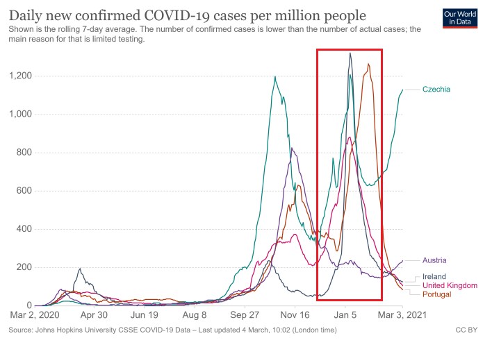 Der nahezu senkrechte Anstieg ist bei allen Ländern bei der dritten Welle ähnlich. Während man in Tschechien nichts aus der vorangegangen Katastrophe (mit Triage) gelernt hat, war der strenge Lockdown in den anderen Ländern erfolgreich. Statt aus den Fehlern der vorangegangen Wellen zu lernen, geschweige denn bei den Nachbarländern, steuert Österreich in eine starke dritte Welle und in den nächsten harten Lockdown.