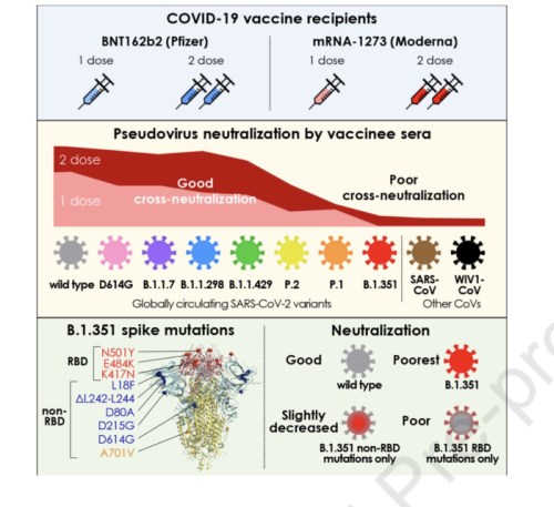 Soweit so gut. Wenn es um die Virusvarianten geht, dann ist die Pole-Position der mRNA-Impfstoffe nicht mehr so überragend. Da zeigt dieses Preprint-Paper, dass es zwar gegen die in Österreich dominant gewordene Britische B.1.1.7-Variante unverändert gut wirkt, aber gegen die brasilianische P.1-Variante schon nicht mehr so gut und am schlechtesten gegen die Südafrika B.1.351-Variante, die sich nicht nur in Tirol, sondern auch in Ostösterreich zunehmend ausbreitet, aber anscheinend keinen evolutionären Vorteil gegenüber B.1.1.7 haben dürfte.