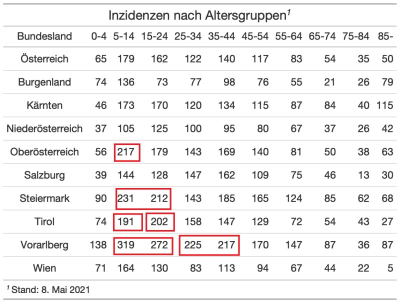 Die aktuellen Empfehlungen des Vereins “Österreichische Gesellschaft für Kinder und Jugendliche” vom 07. Mai 2021 treffen dieselben veralteten Annahmen wie im Herbst 2020 (PLURV) und stehen damit voll auf Durchseuchung der Kinder im restlichen Schuljahr. Kinder lassen sich am leichtesten durchseuchen, weil sie die geringsten Mortalitätsraten aufweisen. Dass sie LongCOVID aber mindestens so stark wie Erwachsene trifft, wird dabei unter den Teppich gekehrt. Das Risiko für schwere Verläufe und Tod ist zwar viel geringer als bei Erwachsenen, doch sind sie genauso infektiös wie Erwachsene und können es an ungeimpfte Eltern und Großeltern weitertragen. Die AGES-Clusterdaten, die den Indexfall häufig bei den Erwachsenen (bzw. Pädagogen) sehen, sind irreführend, weil Kinder deutlich seltener getestet werden als Erwachsene und bei negativem Antigentest keine Nachtestung mit PCR-Test erfolgt. Hier kommt es zu einem Perception Bias, der zu den bekannten Vorurteilen “Lehrer tragen das Virus in die Schule” und “Die Eltern gehen ständig auf private Feiern und stecken so die Kinder an.” führt.