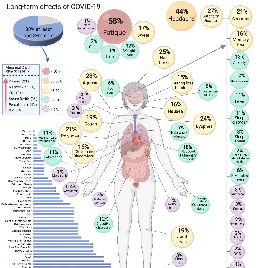 Zu den häufigsten anhaltenden Symptomen zählen Fatique, Kopfschmerzen, Konzentrationsprobleme, Haarausfall, Geschmacks- und Geruchsverlust, Kurzatmigkeit, Hyperventilieren, Husten und Gelenkschmerzen, Gedächtnisverlust, Schwitzen, Übelkeit und Engegefühl in der Brust. Man stelle sich alleine vor, den Geschmackssinn dauerhaft zu verlieren oder über Monate mit einem fauligen Geschmack leben zu müssen, sobald man etwas isst oder trinkt – ein erheblicher Verlust an Lebensqualität! Für einen Koch hieße das Berufsunfähigkeit.