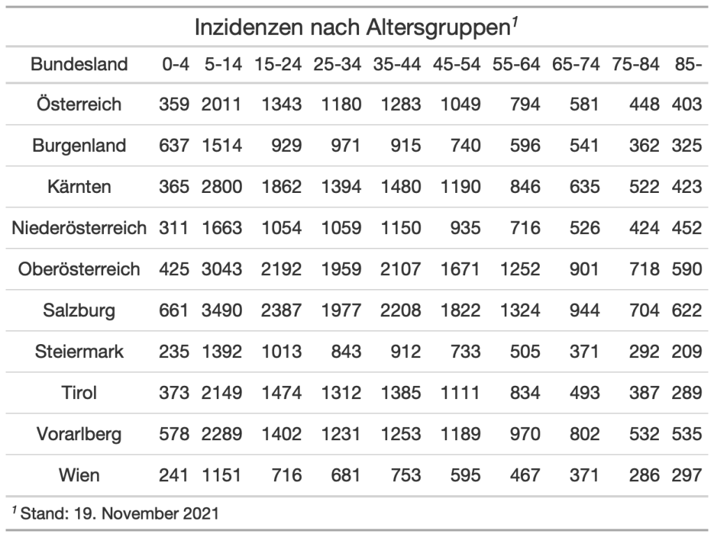 Ab Montag, 22. November 2021, kommt also der erwartete, aber viel zu spät ausgerufene Lockdown “light” nach Vorbild des “erfolgreichen” Lockdowns im Herbst 2020, der mit Unterbrechung durch das Weihnachtsgeschäft dann bis 8. Februar 2021 andauerte. Fakt ist: Wir HABEN bereits Triage, und die Not ist so groß, dass das nicht mehr verschleiert wird, sondern offen zugegeben wird. Es häufen sich Berichte mit älteren Menschen, die von Intensivstationen auf Palliativstationen (zum Sterben!) verlegt werden. Die Not ist also noch viel höher als im Vorjahr VOR dem Lockdown. Ebenso sind die Inzidenzen bei den Kindern am höchsten, dazu kommen etliche Impfdurchbrüche, auch bei Lehrern mit zweifacher AZ-Impfung. Und drittens – öffentlich weiterhin kein Thema – die Zahl der LongCOVID-Patienten steigt rasant.