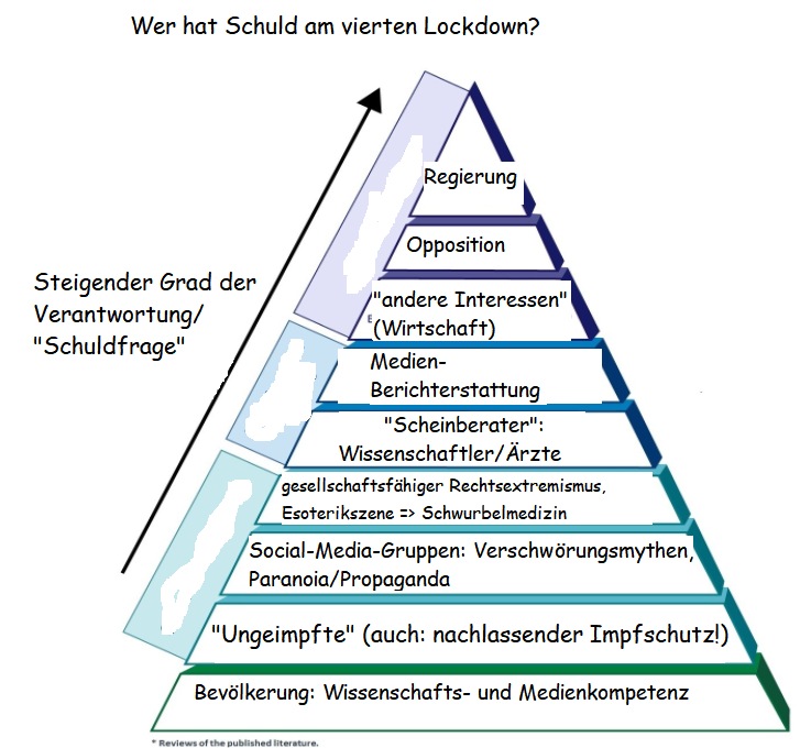 In der Gesamtbevölkerung fehlt die Wissenschafts- und Medienkompetenz, Experten von Scheinexperten zu unterscheiden, richtig von falsch, trotz Verordnung dennoch Maske zu tragen, Aerosol-Übertragung zu berücksichtigen, zu wissen, dass 3G keine 100% Sicherheit bietet, wenn nicht kontrolliert wird oder gefälschte Zertifikate zirkulieren, und Geimpfte genauso Überträger sein können, wenn auch kürzer als Ungeimpfte. Alles zu glauben, was im Boulevard steht, aber leider auch, was der ORF sendet oder im FALTER steht. Zu glauben, als Geimpfter könnte man an großen Familienfeiern oder Vereinsfestln teilnehmen, indoor, und keiner würde sich infizieren. Zu glauben, die Impfung macht aus jedem Durchbruch maximal einen Schnupfen. Milder Verlauf heißt nur nicht Krankenhaus, kann aber wochenlang niederknüppeln.