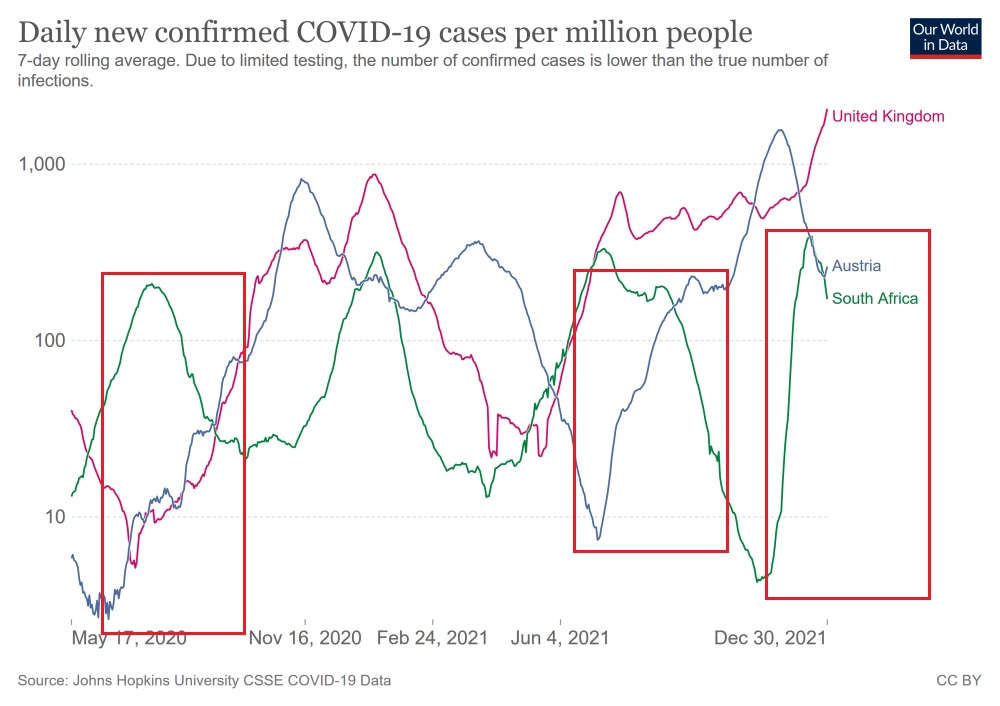 Der Wiederanstieg im ersten Pandemiejahr 2020 fand bereits ab Mitte Juni statt, der Wiederanstieg im zweiten Pandemiejahr 2021 mit DELTA ebenfalls ab Mitte Juni, aber viel steiler. Eine ähnliche Entwicklung ist in UK beobachtbar. In Südafrika baute sich die OMICRON-Welle im Dezember auf, wenn auf der Südhalbkugel Sommer ist. Spekulationen zufolge könnte die Mutation N501Y in der rezeptorbindenden Domain den saisonalen Effekt eliminieren und sich daher besser an wärmere Klimazonen anpassen. DELTA und OMICRON beinhalten diese Mutation. Was wird nach BA.2 kommen?