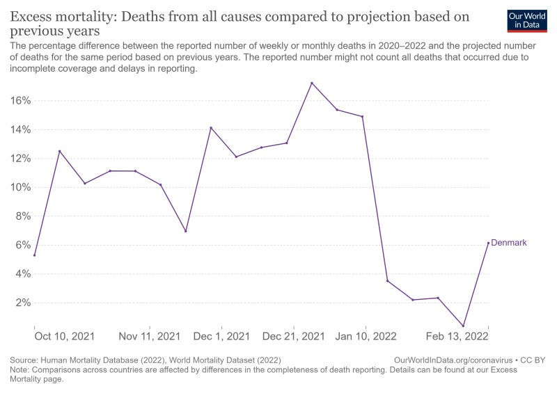 Vergleiche zwischen dem Russlandkrieg und der Pandemie sind nicht besonders sinnvoll, aber es muss einem schon klar sein, dass wir mangels Ergreifung nachweislich wirksamer Maßnahmen wie Ventilation und Luftfilter und konsequentem Maskentragen in geschlossenen Räumen derzeit in ganz Europa tausende Tote pro Tag in Kauf nehmen, das sind dutzende Flugzeugabstürze oder Busunglücke. Und durch die schon in Kraft getretenen und weiterhin geplanten Schritte zum weitgehenden Abbau von Schutzmaßnahmen werden sich diese Zahlen vermutlich noch erhöhen, wie man aktuell am Beispiel Dänemark sieht, deren Übersterblichkeit steil ansteigt, seit sie den “Freedomsday” ausgerufen haben.