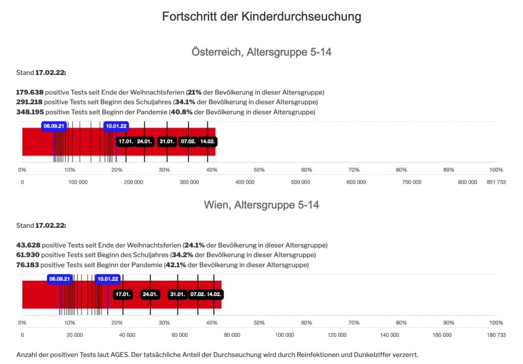 Ebenso war klar, dass die Impfung für die 5-11jährigen erst wenige Wochen vorher freigegeben wurde und die Impfrate sehr niedrig sein würde, bevor OMICRON über uns hinwegrollte. Und es war sowohl für den Gesundheits- als auch den Bildungsminister klar, dass die 0-4jährigen noch keine freigegebene Impfung nutzen konnten. Es wussten aber alle von LongCOVID und dem für Kinder gefährlichem Multientzündungssyndrom MIS-C. Nach aktuellen Studiendaten (Quelle wird nachgereicht) senkt die Impfung das Erkrankungsrisiko an MIS-C von 1:3000 bis :15000 vor der Impfung auf 1:1 000 000. Warum also setzt man die Kinder in Österreich jetzt einem unnötigen Risiko aus und LOCKERT die Maskenpflicht bei einer 5-14jährigen Inzidenz von 3800! Ich halte es auch für ausgesprochen zynisch zu sagen, dass die Impfung für diese Altersgruppe schon längst zugelassen wäre, denn Kinder sind darauf angewiesen, dass ihre Eltern diese Chance nutzen und der seit zwei Jahren andauernden Verharmlosungskampagne in Politik, Medien und durch Kinderärzte und selbst sogenannten Experten widerstehen. Und auch ein Kind mit Verschwörungseltern hat eine Chance verdient, etwa durch eine Impfpflicht für Unter 18jährige.