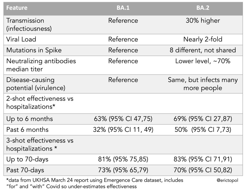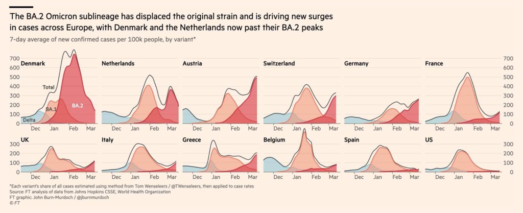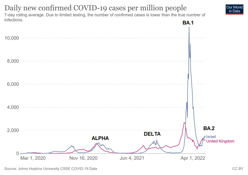 In Ländern wie Israel und UK (beide nur 56% Boosterquote, Israel hat auch für die Allgemeinheit schon die 4. Impfung angeboten), wo man von einer hohen Immunisierungsrate ausgehen würde, in UK laut Schätzungen über Antikörpertests über 99% “immun” durch Infektion oder Impfung, steigen die Zahlen mit BA.2 jetzt erneut an. Bis DELTA hat die drei-teilige Grundimmunisierung die Infektionsrate noch verhältnismäßig gering halten können, seit BA.1 haben wohl Reinfektionen als auch Durchbruchsinfektionen stark zugenommen.