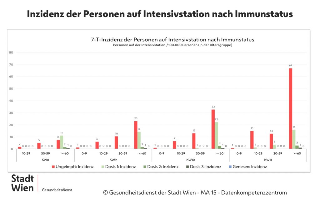 Mit Abstand am höchsten ist die Inzidenz in allen Altersgruppen bei den Ungeimpften, dann kommen die Einmalgeimpften. Bei 2fach- und 3fach Geimpften ist die Inzidenz deutlich niedriger. Die Impfung schützt also weiterhin sehr gut vor schweren Verläufen mit Hospitalisierung.