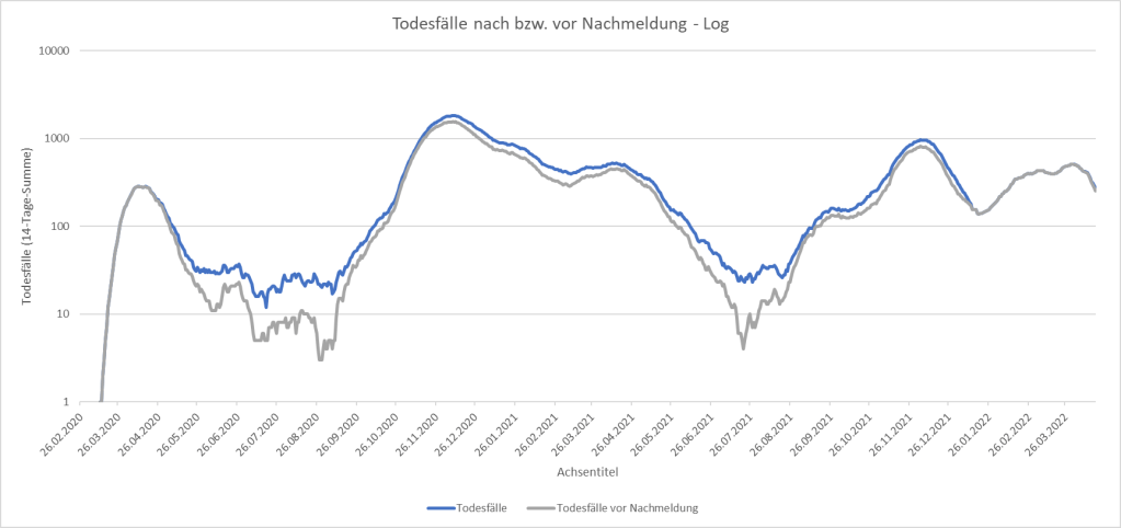 Nun wurden also auf einen Schlag 3412 Todesfälle aus den Jahren 2020 und 2021 nachgemeldet. In allen Bundesländern erhöhen sich vor allem die Todeszahlen in der zweiten Welle (Herbst 2020) deutlich, auch in der Zeit um und nach Weihnachten sowie in der DELTA-Welle im Herbst 2021.