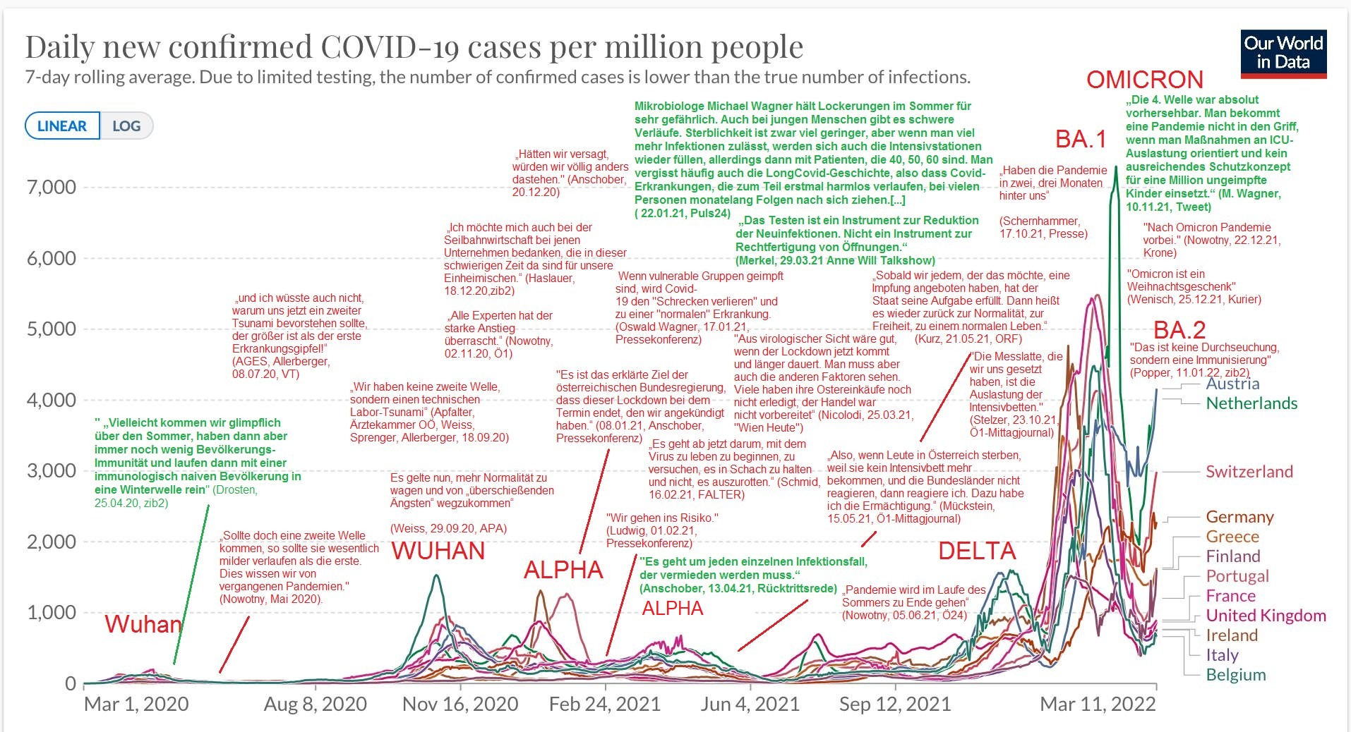 Grafik für die Inzidenzen nach den beiden Benefizkonzerten am 19.3.22 im Ernst-Happel-Stadion (ca. 40 000 Besucher) und am 27.03.22 am Heldenplatz (ca. 100 000 Besucher), Quelle: Statistiker Erich Neuwirth