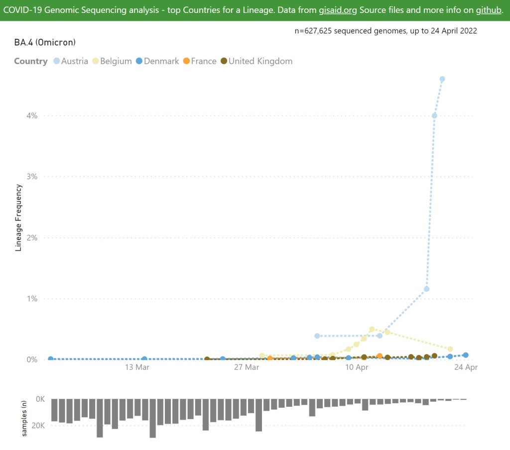 BA.4 ist wahrscheinlich aus einer Rekombination von BA.1 und BA.3 entstanden. In Südafrika und einzelnen anderen Ländern wurden die Subvarianten BA.4 und BA.5 als Erstes gefunden, die zumindest in Südafrika BA.2 zu verdrängen scheinen. Über Infektiösität und Schwere der Verläufe ist noch nichts bekannt, aber sie haben zumindest zwei Mutationen, die Immun Escape verstärken können (L452R und F486V). Es wird damit gerechnet, dass dadurch eine (größere) Reinfektionswelle erzeugt werden kann. Es gibt anekdotische Berichte zu auffallenden Symptomveränderungen wie sehr schwere Atemwegsinfekte, schwere Ohrinfekte, die bei den vorherigen Varianten noch nicht beobachtet wurden, dazu anhaltende Übelkeit, Erbrechen, schwere Dehydration und keine Verbindung zu Vorerkrankungen. Bisher wurde das aber noch nicht aus einer zweiten Quelle bestätigt.