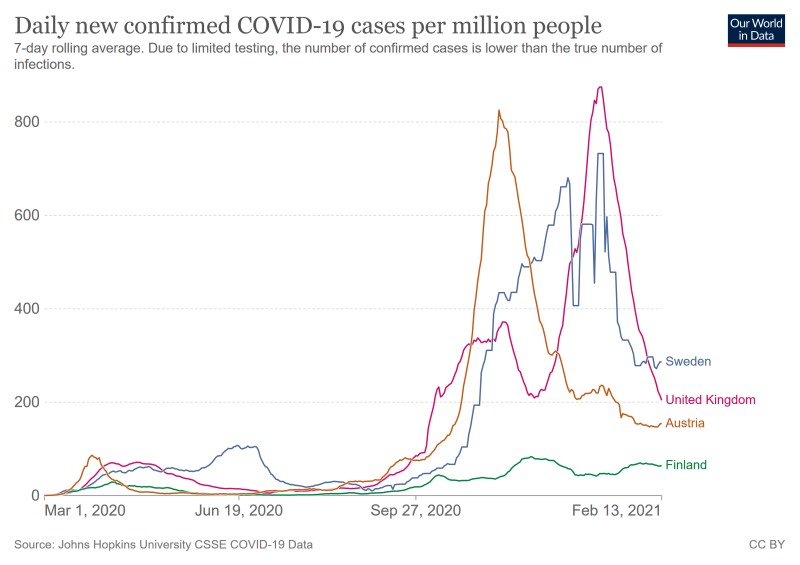 Tatsächlich blieben die Wellen in Finnland auch im Herbst und Winter flach, sie verfolgten eine NoCovid-Strategie, während Österreich zu spät in den zweiten Lockdown ging. In Schweden gab es nie einen Lockdown, sie hatten eine deutlich höhere zweite als die erste Welle. In Großbritannien kam der erste Lockdown zu spät, sie erreichten dennoch Rekordwerte in der zweiten Welle. Der Grund für die Fehlannahme war eine viel zu hohe Immunisierung (Durchseuchungsrate), die aber so nicht vorlag. Anfang Mai waren gerade einmal 0,15% der Bevölkerung infiziert. Wie wir später erfuhren, lag der Schwerpunkt in der ersten Welle in Tirol, in den anderen Bundesländern gab es deutlich weniger Infektionen.