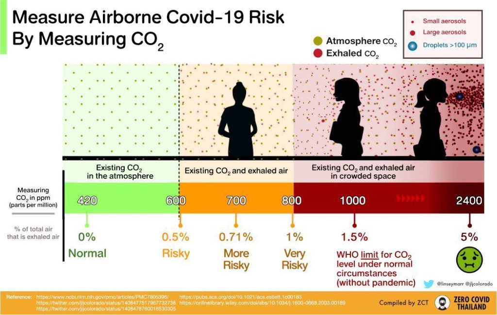 Und dann passiert es, dass man wegen einer Ultraschalluntersuchung ein großes Labor aufsucht. Am Eingang steht ein Handhygienespender. Drinnen sind alle Fenster geschlossen. Ich wartete 40min bis zur Anmeldung, dann gab es wegen technischer Probleme noch etliche Minuten, bis ich aufgenommen wurde. Ich holte das Aranet4 hervor, es schoss gleich in die Höhe und erreichte mehrfach Spitzenwerte über 2000ppm. Die Luft war zum Schneiden dick. Im Wartezimmer war jeder Stuhl besetzt, nicht einmal ein Meter Abstand, es liefen ständig Mitarbeiter durch den Flur. Nicht alle Patienten trugen die Masken richtig, nicht einmal die Mitarbeiter. Ein Vollbart hat unter der Maske nichts zu suchen, wenn sie dicht sein soll! (Prince et al. 05/22) Eine Assistentin zog die Maske runter, um mir etwas zu sagen. Ich hätte am liebsten draußen gewartet, aber die Anmeldung ging über ein Ticketsystem und draußen hätte ich den Monitor nicht gesehen, um zu wissen, wann ich dran bin.