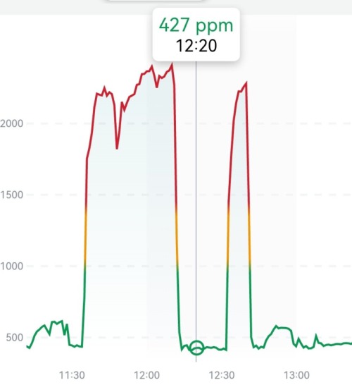In anderen Labors bzw. Arztpraxen maß ich deutlich geringere Werte, vielfach sogar unter 600ppm oder nur knapp darüber. In einer Wahlarztpraxis waren nur wenige Personen im Wartezimmer, es gab sogar einen Lichthof mit Bänken zum Draußen sitzen, die Tür stand dauernd offen. In einem anderen großen Diagnosezentrum hatte ich meinen Aranet4 nicht dabei, aber es machte einen gut belüfteten Eindruck, zudem kurze Wartezeiten.