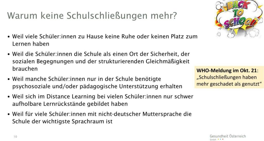 Bei der Zuständigkeit von Maßnahmen für Schulen schieben Polaschek und Rauch sich öffentlich gegenseitig die Verantwortung zu. Offenbar ist es so, dass sie sich im beiderseitigen Einvernehmen ausmachen, was in den Schulen gilt. Da es kaum Maßnahmen gibt und auch laut den Aussagen Rauchs und aus dem Kabinett Koglers, gewichten sie die psychische Belastung durch Lockdowns offenbar höher als das Erkrankungsrisiko der Kinder selbst (bzw. deren Geschwister und Eltern). Durchseuchung habe es nie gegeben, den Begriff wies er entschieden zurück.“