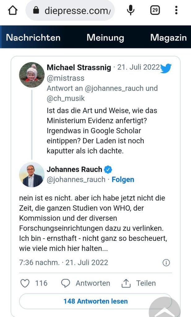 Eine exzellente Zusammenfassung der Twitterdebatte hat der STANDARD geliefert. Es sind aber nicht nur die offenkundigen Falschmeldungen, die hier erschüttern, sondern auch, dass Rauch davon ausging, dass die Suchbegriffe “psychische Erkrankungen Kinder COVID” klar zeigen würden, dass die Maßnahmen zu den psychischen Folgen geführt hätten. Rauch ging offenbar davon aus, dass beliebige Treffer seiner Googlesuche seine falsche Behauptung zu 100% stützen würden. Er weiß also nichts über die Vielschichtigkeit der Faktoren, die zum Anstieg psychischer Erkrankungen bei Kindern führen. Seine Berater haben ihm entweder aus Inkompetenz oder ideologischen Hintergründen (Interessenskonflikte, Schwurbler) falsche Informationen zukommen lassen. Citizen Journalist-Kollegin Shirley hat das in einem Thread messerscharf zusammengefasst und bringt es auf den Punkt: