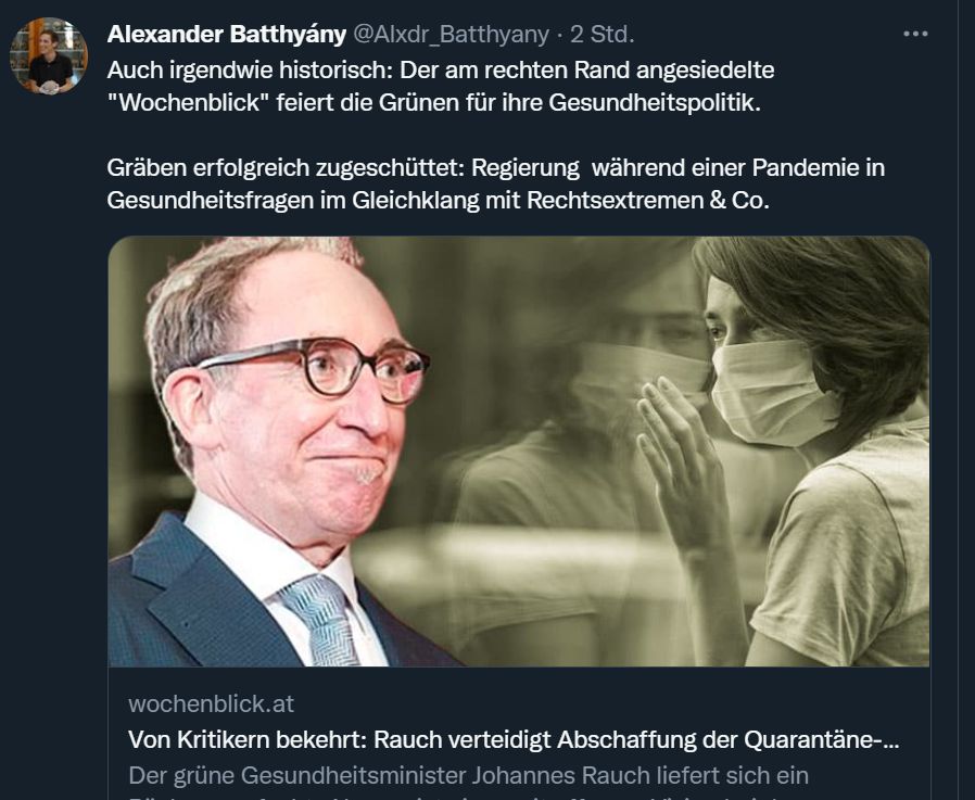 In der Vergangenheit gab es mehrfach Vorfälle auf Twitter, wo grüne Politiker sehr herablassend gegenüber kritischen Bürgern waren. Sie verglichen die Kritik von Menschen, die vor Infektionen warnen, mit jenen von Querdenkern oder Trump-Anhängern (“but her emails”). Sie setzten damit NoCovid mit Covidleugnern gleich. Die Medien, vor allem der ORF, bereiteten den Nährboden dafür durch regelmäßige Schmutzkampagnen gegen “Null Covid”, meistens gegen China, deren Lockdowns die europäische Wirtschaft und ihre eigene schädigen würden. Niemand sieht den langfristigen, über Jahre hinaus gehenden Benefit für eine gesunde Bevölkerung, die arbeitsfähig bleibt, gegenüber einer durch wiederholte Reinfektionen und LongCOVID geschwächten Bevölkerung mit wachsender Übersterblichkeit, weil das Gesundheitssystem zusammenbricht. Die Schmutzkampagne gegen den ehrenwerten Ansatz, Infektionen vermeiden zu wollen, setzt sich sogar im kürzlich vorgestellten Variantenmanagementplan der Regierung (Vs. 01.09.22) fort. Unter “best case scenario” steht da: