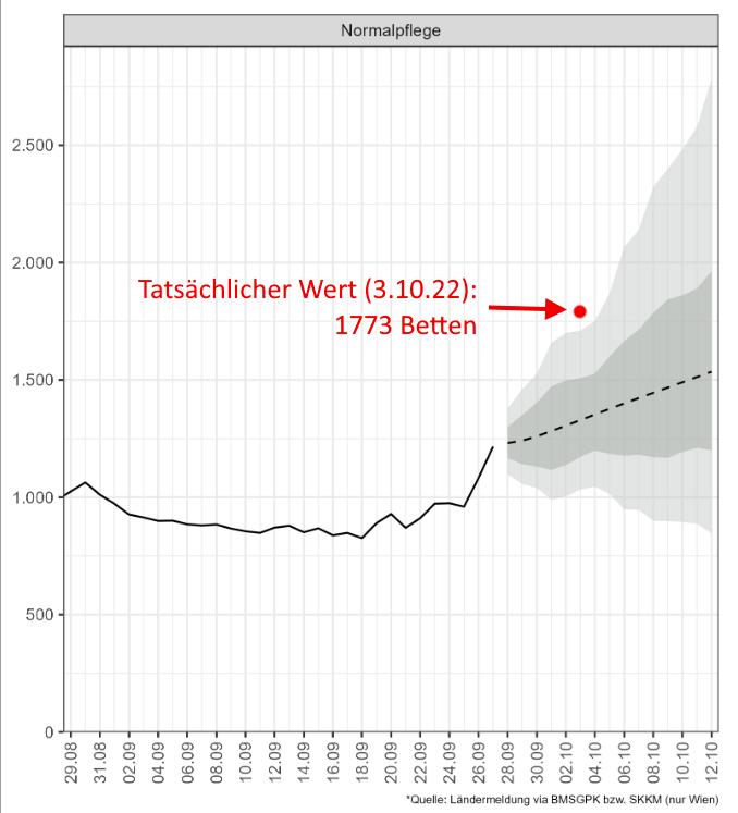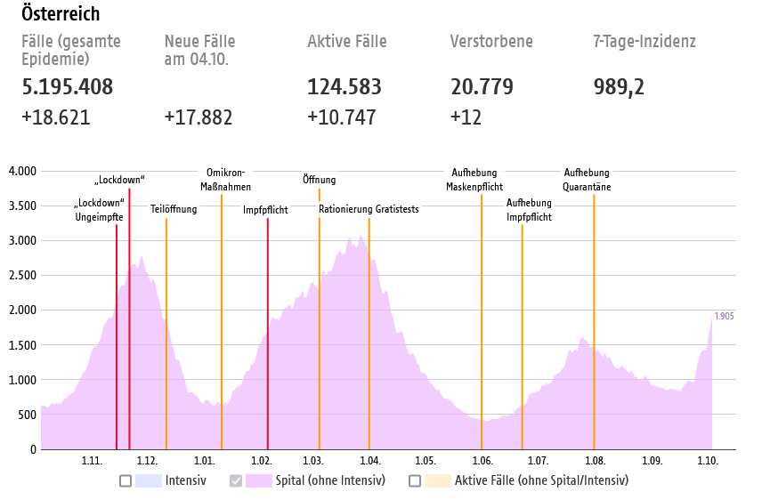 Obwohl nicht nur die Infektionszahlen rasch steigen, sondern auch die Spitalszahlen, kommen keine neuen Maßnahmen. Der Grund ist so banal wie opportunistisch: Am 9. Oktober ist die Wahl des neuen (alten) Bundespräsidenten. Nächstes Jahr finden außerdem in Niederösterreich Landtagswahlen statt, die ÖVP könnte die absolute Mehrheit verlieren und die Schwurbelpartei MFG einziehen. Polaschek und Rauch haben seit Amtsantritt offenbar beide beschlossen, die Pandemiewellen auszusitzen und machen einfach nichts. Zum Sinneswandel von Rauch vor und nach Amtsantritt habe ich am 21.06.22 gebloggt. Zum mangelnden Vertrauen in die Politik schrieb Jurist Nikolaus Forgó am 06.10.22 einen Gastbeitrag im STANDARD.