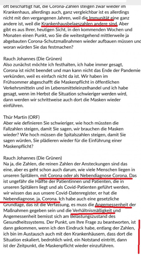 Nicht nur die Antworten sind entlarvend, auch die Fragen. Thür, der dieses Jahr mit dem Robert-Hochner-Preis für “akribische Arbeit, persönlichen Mut und konsequent geführte Interviews” ausgezeichnet wurde, nimmt Rauch die Antwort vorweg: Die Immunität sei eine andere, sagt er. Fakt ist, das Virus hat sich weiter entwickelt – zwischen Wildtyp und BA.5 liegen mit 90 Mutationen evolutionär Welten und SARS-CoV2 ist längst nicht am Ende des Mutationsspielraums angelangt. Unser bis letzten Monat verimpfter Impfstoff wurde für den Wildtyp entwickelt. Die neuen Virusvarianten bedrohen auch Menschen mit Immunschwäche, weil weder der Prophylaxe-Antikörpercocktail Evusheld noch therapeutische Antikörper das Virus neutralisieren können. Der Antikörperschutz der Impfungen lässt nach – bei älteren Menschen noch schneller – das ist bekannt. Bei Kindern sind, wie oben geschrieben, 78% noch gar nicht geimpft. Weshalb es sinnvoll ist, Kinder auch nach einer Infektion noch zu impfen, zeigen die Hospitalisierungsraten und der Vergleich mit Influenza (Tso et al. 2022). Zudem schützen sie damit auch ihre Klassenkameraden, denn Kinder mit Immunschwäche habe ein höheres Sterberisiko. Überhaupt – LongCOVID wurde im Interview völlig ausgeklammert.