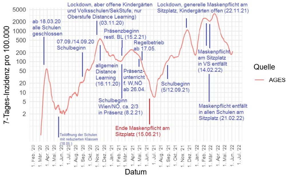 Schulen (und Kindergärten) sind Drehscheiben der Virusausbreitung, weil bis auf Großveranstaltungen und Nachtgastronomie an keinem anderen Ort so viele unterschiedliche Haushalte über längere Zeit auf engstem Raum aufeinandertreffen. Eine hohe Durchimpfungsrate bei Kindern und Jugendlichen hätte bereits kurz nach Zulassung der Impfstoffe geholfen, die Zahl der Neuinfektionen zu senken. FFP2-Masken im Unterricht erwiesen sich als wirkungsvoll und konnten Klassenschließungen verhindern. Wo es eine FFP2-Maskenpflicht gab, hing leider mangels Vorgaben der Behörden vom jeweiligen Goodwill des Schuldirektors ab. CO2-Messungen in Schulräumen hätte die Steuerung der Frischluftzufuhr optimieren können, Luftreiniger hätten unterstützend eingesetzt werden können – spezial in Räumen mit schlechter Ventilation. Auch andere Infektionserreger, die zu vermehrten Krankenständen unter Kindern und Jugendlichen führen, hätten so deutlich reduziert werden können.