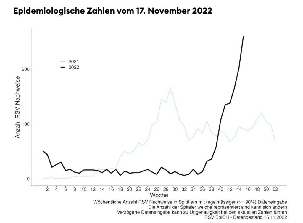 CNN meldet zudem zehn Mal höhere RSV-Hospitalisierungsraten bei Senioren (15.11.22), was ungewöhnlich im Vergleich zu den Vorjahren ist. Sie vermuten nachlassende Vorsicht und aufgehobene Schutzmaßnahmen als Hauptgrund.