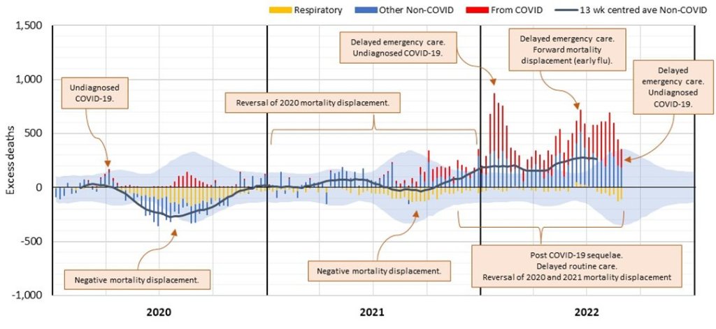 Ehemalige ZeroCovid-Länder wie Australien leiden zwar ebenso unter der Aufhebung aller Maßnahmen wie bei uns, dafür gibt es selbst dort viel umfassendere und transparentere Datenaufbereitungen. Aus diesem Blog mit zahlreichen interessanten Abbildungen geht hervor, dass die Lockdowns zu einer Untersterblichkeit geführt haben. Mitte Jänner 2022 hat Australien die ZeroCovid-Strategie aufgegeben, seitdem stieg die Übersterblichkeit stark an – einerseits durch Kollateralschäden wie verzögerte Notfallbetreuung, andererseits auch durch LongCOVID-Folgen.