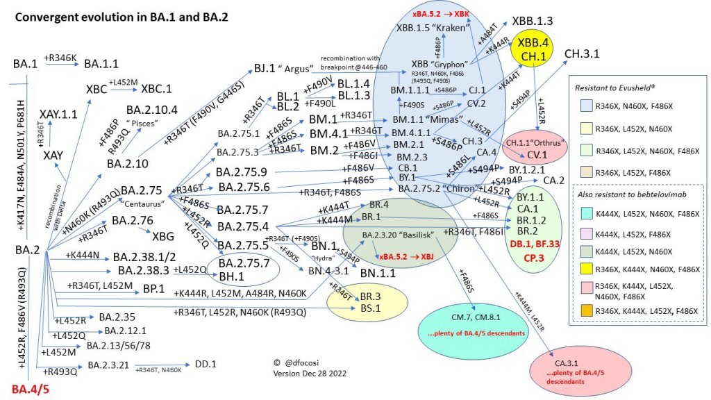 XBB ist eine Rekombinante aus zwei BA.2-Sublinien (BJ.1 und BM.1.1.1). BA.2 wird von den derzeit zugelassenen angepassten Impfstoffen (bivalent BA.1 und BA.5) nicht exakt erfasst, wirken aber wahrscheinlich immer noch besser als die rein auf den Wildtyp zugeschnittenen Impfstoffe. In den USA hat sich der Anteil von XBB.1.5 innerhalb von nur einer Woche verdoppelt, er betrug am 31.12.22 bereits 40% und verdrängt die bis dahin vorherrschende BQ.1 und BQ.1.1.-Sublinien.
