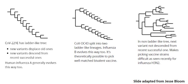 Die Entwicklung von Virusvarianten bei SARS-CoV2 war durchaus vorhergesagt. So hat man menschliche Blutseren aus den 80er und 90er Jahren gegen spätere Virusstränge des humanen Coronavirus 229E getestet und festgestellt, dass sie dieses schlechter neutralisieren konnten. 229E hat also sein Spike-Protein kontinuierlich verändert, um der Immunantwort besser zu entkommen (Eguia et al. 12/2020 preprint).