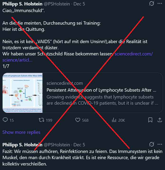 “Audience capture” hat viele User auf Twitter, später Bluesky, befallen, die mutige Aussagen gegen den Strom treffen. Dagegen spricht grundsätzlich nichts, wenn man seine Aussagen gut begründen kann, und zwar so, dass es jedermann nachvollziehen kann. Aussagen wie “es gibt Schäden nach jeder Infektion, sie sind nur unsichtbar.” sind nicht nachvollziehbar und erinnern an die Homöopathie, wo ein zig verdünntes Nichts eine Wirkung haben soll. “MIR hat es aber geholfen” ist das Totschlagargument, da fährt dann die Eisenbahn darüber. Genau deswegen gibt es objektivierende Studien, um das subjektive Anekdotenelement zu eliminieren, um statistisch signifikante Aussagen treffen zu können über Korrelation und Kausalität. Hat es wirklich geholfen oder war es der Placebo-Effekt? Stammen die Schäden wirklich von einer unbemerkten Covid-Infektion oder einer anderen Erkrankung?