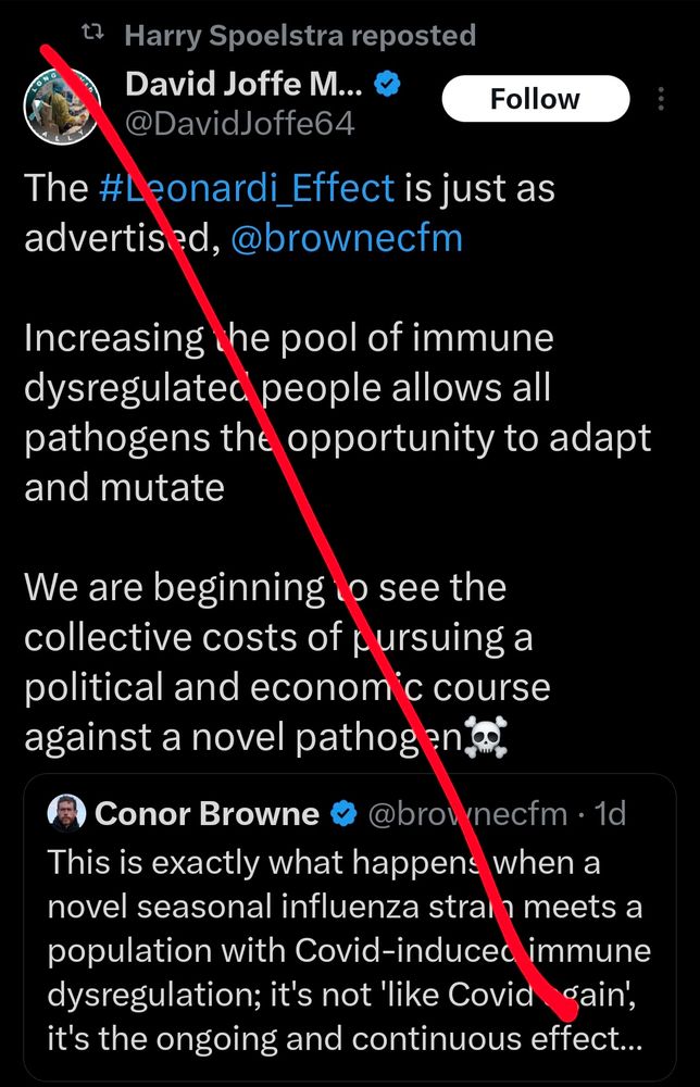 Die Covid-Doomer-Sekte geht aber noch weiter, sie sehen nicht nur den “Leonardi-Effekt” belegt, sondern darin auch die Begründung für das heuer mutierte Influenzavirus. Schmerzhafterweise sehe ich hier Accounts, denen ich selbst noch vor einem Jahr gefolgt bin: Harry Spoelstra, Conor Browne, darüber hinaus auch Spela Salamon, Vipin Vashishta, Yaneer Bar-Yam u.v.a. Dabei hat die aufkommende starke Influenzasaison 2025/2026 NICHTS mit Covid zu tun!