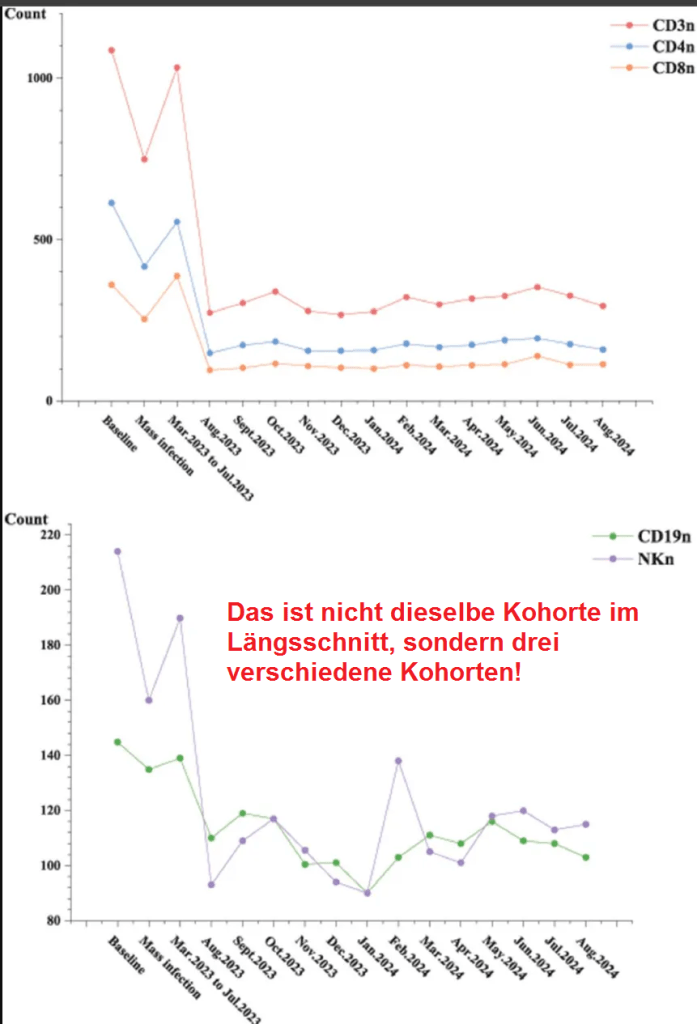 Die wichtigste Einschränkung, die im Beitrag von Holstein nicht erwähnt wird – übrigens auch sonst nicht von allen Accounts, die in dem Artikel einen Beleg für den “Leonardi-Effekt” sehen wollen (Anthony Leonardi behauptet seit Pandemiebeginn, SARS-CoV2 würde unser Immunsystem dauerhaft schwächen und vergleicht es mit AIDS): Es handelt sich um drei unterschiedliche Kohorten – einer vor Covid (China: Januar 2021 bis November 2022), einer während der Durchseuchung (Dezember 2022 bis Februar 2023) und einer nach der Durchseuchung (März 2023 bis August 2024). Es lassen sich also auf individuellem Niveau gar keine Aussagen darübertreffen, wie sich einzelne Infektionen ausgewirkt haben. Die Darstellung als Liniengraph suggeriert das aber!