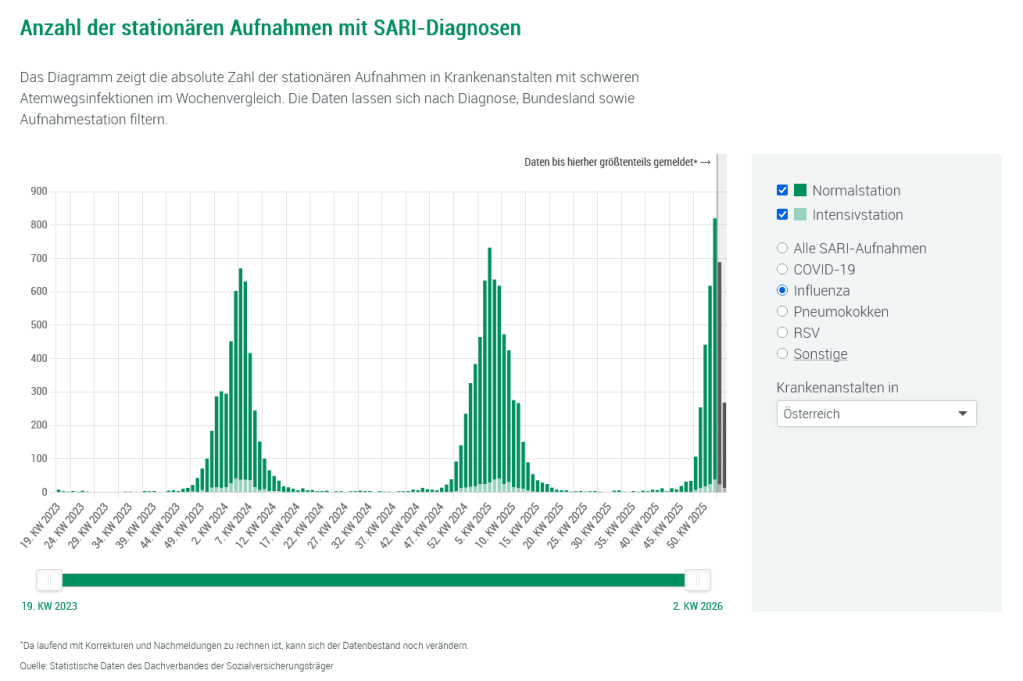 Wie an anderer Stelle schon betont, ist das Influenzavirus heuer an sieben Stellen am Kopf des Hämagglutinins (H3HA) mutiert (subclade K). Durch die Impfung erzeugte Antikörper erkennen das Virus nicht so gut, weshalb die Übertragungsraten heuer erhöht sind. Das bedeutet aber nicht, dass die Verläufe unbedingt schwerer sein müssen, wie die Virologin Angela Rasmussen unterstreicht. Die Impfung verringert die Schwere der Erkrankung substantiell, selbst wenn Impfstrang und zirkulierender Strang nicht gut zusammenpassen (Yegorov et al. 2025). Davon kann die österreichische Bevölkerung bei mickrigen 13% Impfrate aber nicht profitieren. Da die Influenzsaison noch einige Wochen anhalten wird, ist es auch jetzt noch sinnvoll, die Impfung nachzuholen.