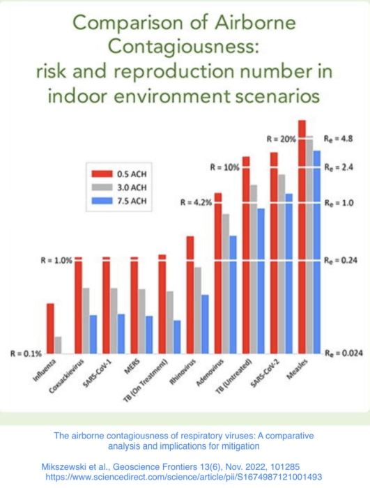 Re entspricht der mittleren Anzahl von Ansteckungen, die von einer infizierten Person ausgehe. Daraus ist ersichtlich, dass bereits ein mäßig gelüfteter Raum das Ansteckungsrisiko bei Influenza auf Null reduziert, das harmlosere Rhinovirus ist deutlich ansteckender. SARS-CoV2 ist ungefährlich gleich ansteckend wie unbehandelnde Tuberkulose. Am ansteckendsten sind Masern, die selbst bei hoher Luftwechselrate immer noch zu nennenswerten Übertragungen führen.