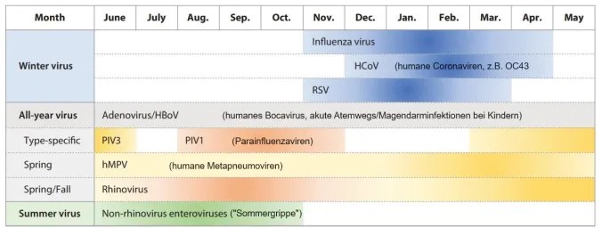 - Influenza, Parainfluenza, RSV und Coronaviren sind durch eine Lipidhülle geschützt. Rhinovirus-14 weist keine Lipidhülle auf und überlebt bei hoher Luftfeuchte besser. Allgemein sind die Viren bei Kälte stabiler als bei Wärme.