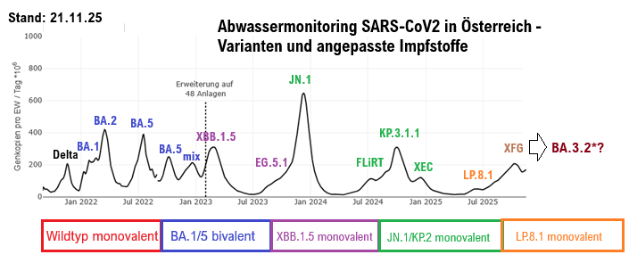 Im November 2025 dominieren XFG und Nachfolgevarianten. Aktuell verfügbarer Impfstoff ist mRNA-Pfizer LP.8.1, ab ca. November kommt Protein-Novavax-JN.1 (nicht aktualisiert, anderer Wirkungsmechanismus, weniger reaktiv). Die Influenzasaison hat auf der Nordhalbkugel 2-4 Wochen früher begonnen als die letzten Jahre. Dafür verantwortlich ist H3N2 subclade K mit sieben Mutationen (siehe diesen Artikel von Virologin Angela Rasmussen) – das kann auf eine schwerere Influenzasaison hinauslaufen.