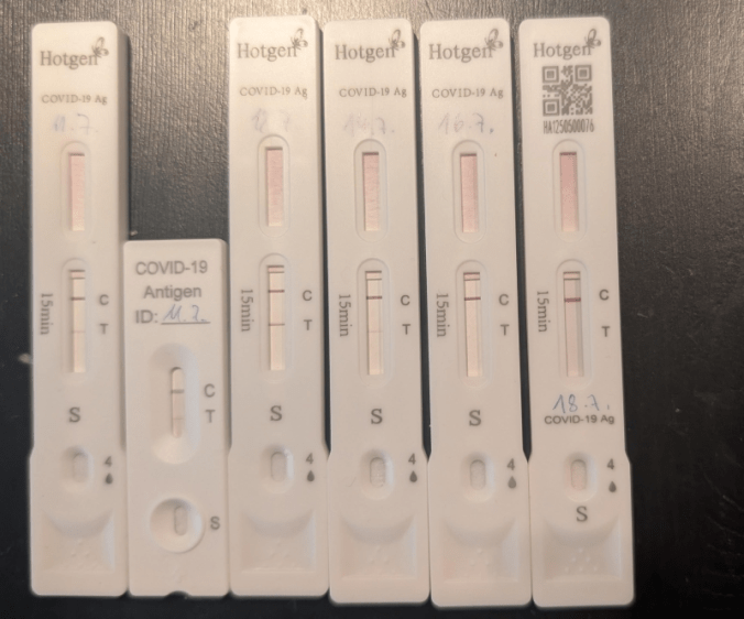 Am dritten Tag (12. Juli) testete ich gleich nach dem Aufwachen im Nasenflügel, der Schnelltest war nun fett positiv und jede Zweifel beseitigt. Ich hatte damit gewisse Hoffnung, niemand angesteckt zu haben. Dank meiner guten Immunität (zehn Impfungen!) bekam ich erst Symptome, bevor die Viruslast anstieg. Jetzt war ich also hochansteckend, aber bereits zuhause und für niemand eine Gefahr.