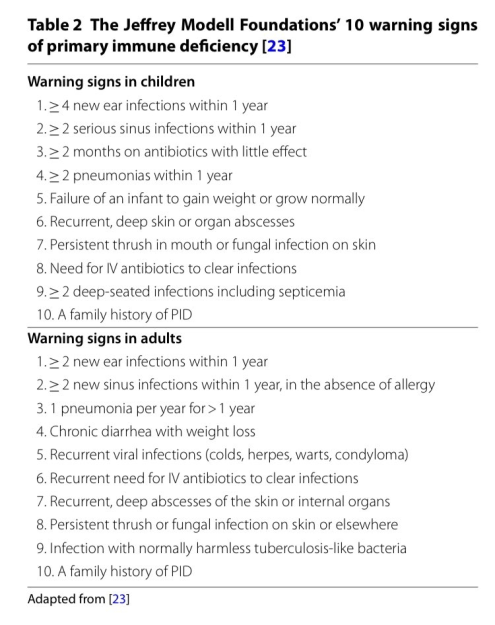 Folgende Warnzeichen bei Kindern und Erwachsen deuten auf eine mögliche primäre Immunschwäche hin und sollte genauer abgeklärt werden: