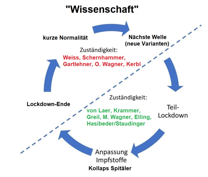Trotz Wechsel der ÖVP-Minister und des -Kanzlers lässt sich kein nennenswerter Strategiewechsel der Regierung in der Pandemie feststellen: Wir lockern in die drohende OMICRON-Welle hinein, wie schon damals bei ALPHA und bei DELTA im Spätsommer, als die Pandemie bereits für beendet erklärt worden ist. Es fehlt weiterhin eine Perspektive, eine Zielinzidenz, ein Endpunkt für die Impfkampagne und ein Ausblick, wie wir 2022 leben sollen. Hinweis: NPIs (v.a. Masken und Tests) werden bleiben, wenn SARS-CoV2 endemisch wird. Statt ständig so zu agieren, als ob die Pandemie irgendwann vorbei ist, sollte man sich darauf einstellen, dauerhaft flächendeckend PCR-Kapazitäten, Contact Tracing und erschwingliche dicht sitzende FFP2-Masken für die ganze Bevölkerung zur Verfügung zu stellen.